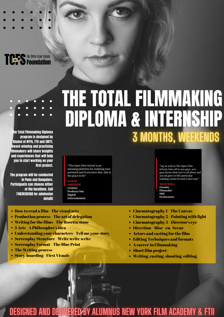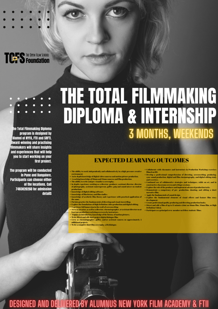 The Total Filmmaking Diploma program is designed by Alumni of NYFA, FTII and SRFTI. Award-winning and practising filmmakers will share insights and experiences that will help you to start working on your first project.
